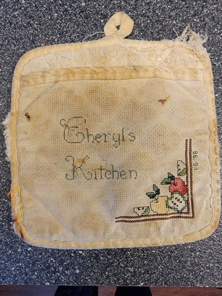 It’s a potholder. It’s a simple off-white potholder with a basic cross-stitch pattern on it. It is stained, burned, and torn. Like many cross-stitched pieces, it has the initials of the person who made it, only the thread has been partly pulled out so it appears to say “I G ‘98.” It should say “KG ‘98” because I made this “piece of art” for my mom as a gift when I was 26 years old. I don’t remember the occasion… perhaps her birthday or Christmas. But I do remember that she hung it on a small hook to display it in her kitchen. She never used it. Back then, I thought of this as a sign that this item was special. She didn’t want to stain or damage it. Instead, she displayed it.